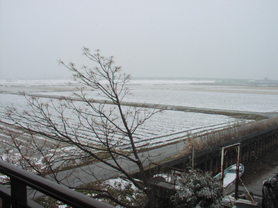 只今11:13、雪がハラハラと降っています。