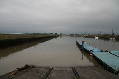 今朝は曇りで微風。吉川港の水はネットリと濁っています。